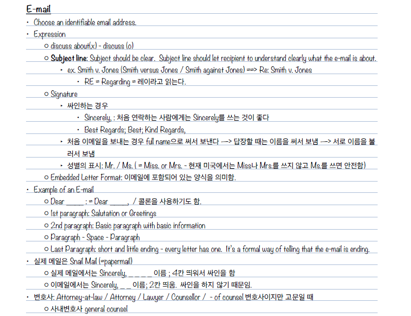 변호사가 된 이래로 영어로 글을 쓰는 업무를 잘하고 싶다는 생각을 하면서도 딱히 해소할 수가 없어서 계속해서 조금씩 갈증을 느끼고 있었는데, 두려워 하고 일을 안하니까 잘 안 늘더라고요. 사실 어차피 지금 다니는 법인에 영국/미국/호주/뉴질랜드 등 영미계 변호사님들이 많으셔서, 제가 영문을 직접 draft해야 하는 일은 거의 없습니다. 다만 고객과의 간단한 e-mail communication이나, 해외 현지 변호사들과의 간단한 의사소통, 아주 짧은 영작 정도는 늘 필요하다는 생각을 했습니다. 이게 business English와는 조금 또 다른 면이 있는게, Business English는 필요한 사람이 많으니(사실 수출이 많은 우리나라 특성상, 어디에나 필요한 면도 있지 않나 싶습니다.) 여기저기 찾아보면 e-mail 정중하게 쓰는 법 등등해서 많은데, 제가 눈동냥으로 보니까 법률 분야에서는 영어 E-mail 작성이나 문장구성들이 아예 다르더라고요.